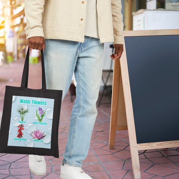 Bring the beauty of water gardens wherever you go. Featuring a serene waterdrop backdrop and four elegant blooms — Papyrus, Water Hyacinth, Cardinal Plant, and Water Lily — this Water Flowers tote captures a peaceful, natural vibe. Ideal for nature lovers, plant moms, and anyone who likes their accessories calm, cool, and beautifully functional.